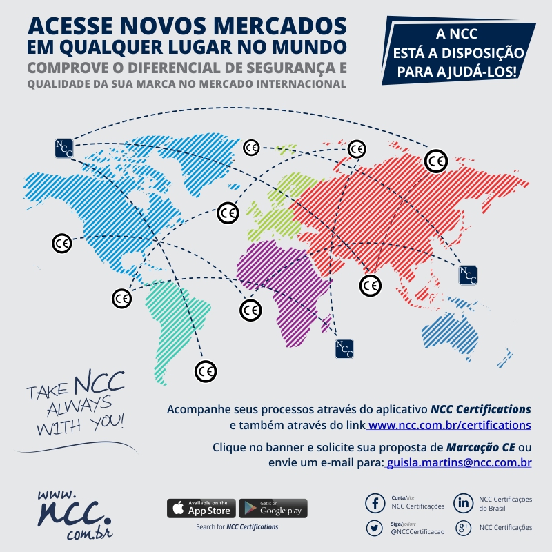 Esses fabricantes podem contar com a NCC para cumprir com os mais diversos requisitos técnicos que são exigidos em diversos países. A NCC mantém forte relacionamento com Organismos Internacionais para obtenção da Marcação CE para equipamentos médicos. Marca da Conformidade para o Mercado Brasileiro de Equipamentos Médicos - Esse é um processo compulsório para os equipamentos regulamentados pela Anvisa e atende também a Portaria do Inmetro.